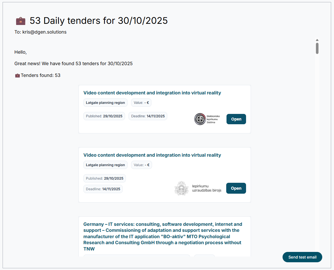 We currently collect tenders from over 50 countries across the EU and beyond, covering industries such as IT, construction, healthcare, consulting, and many others. New sources are added regularly.
