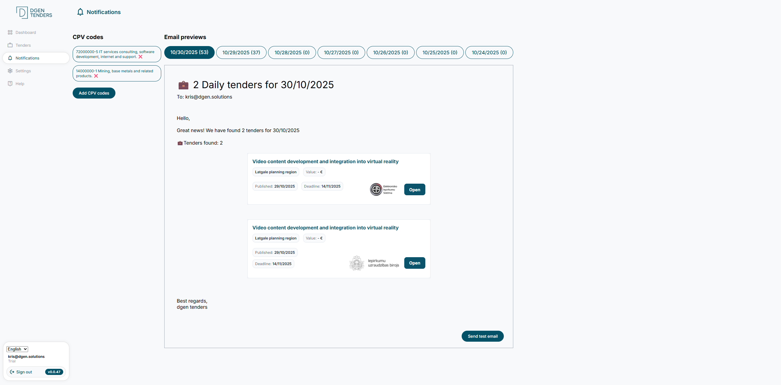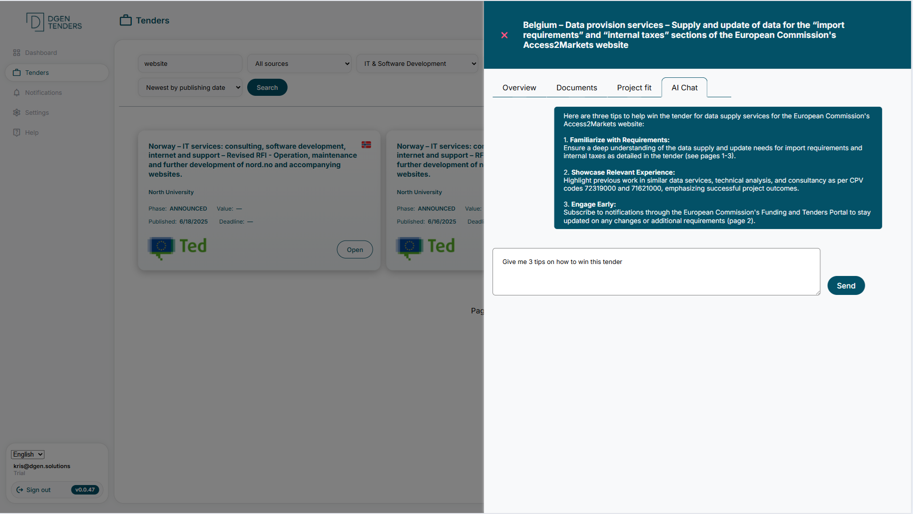 dgen tenders is an AI-powered tender discovery and qualification platform. We collect public tenders from over 50 countries and instantly notify you when new opportunities match your filters. Our AI can even read tender documents, qualify opportunities for you, and help prepare your applications.